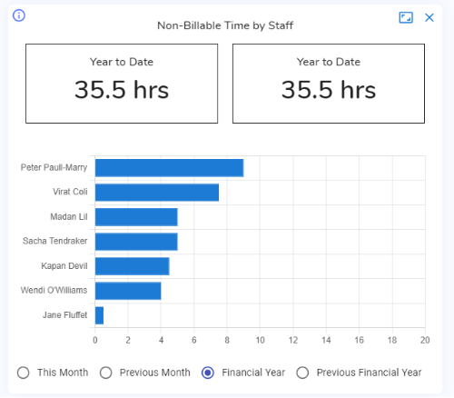 The chart is targeted at the Firm Dashboard so that non-billable time by staff member can be seen firm wide. Or by office, department or team, if the scope is changed.